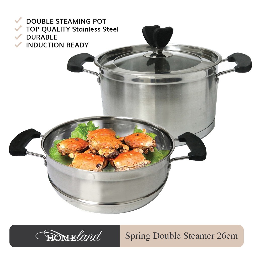 Harga normal = Rp 750.000,-Homeland SPRING Double Steamer- 26cm (Induction) terbuat dari bahan Stainless Steel bermutu tinggi yang didesain secara modern hanya untuk kenyamanan anda dalam memasak. Produk ini dilengkapi lapisan bawah tebal dengan sistem enkapsulasi sehingga menyebarkan panas secara merata dan menjaga kualitas makanan anda.Stainless Steel Bermutu TinggiProduk ini terbuat dari Stainless Steel kualitas tinggi. Produk ini tahan terhadap korosif dan tahan lama. Produk ini juga aman bagi kesehatan keluarga anda.Lapisan Bawah TebalLapisan bawah produk ini terbuat dari bahan yang tebal dengan sistem enkapsulasi yang dapat menyerap dan menyebarkan panas dengan sempurna. Lapisan tebal ini mengurangi resiko makanan anda cepat gosong dibanding produk lain. Selain itu produk ini akan menjaga rasa dan gizi makanan anda, karena panas yang merata saat memasak.Dapat Menggunakan Kompor InduksiProduk ini dapat menggunakan kompor induksi, listrik, gas atau kompor ceramic.Mudah Dibersihkan Produk ini sangat mudah dibersihkan. Cukup menggunakan sabun dan spons lembut. Hindari menggunakan spons keras/besi untuk menghindari goresan pada produk.Tutup Kaca dan Knop Tahan PanasProduk ini dilengkapi tutup dari gelas sehingga memudahkan anda untuk melihat masakan anda. Knop tutup terbuat dari bahan plastic tahan panas yang aman pada saat anda memasak.Pegangan Tahan PanasPegangan di sisi produk terbuat dari bahan plastik tahan panas yang akan membuat anda aman saat memasak.Aman di Mesin Pencuci PiringProduk ini aman menggunakan mesin pencuci piring. Sehingga memudahkan pekerjaan anda di d