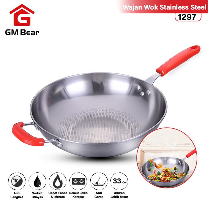 GM Bear Wajan Wok Stainless Steel 32cm 1297 - Wajan Penggorengan Teflon Wok 32cmWajan Penggorengan Wok Gagang merah. Sangat cocok digunakan untuk memasak dalam skala besar. Dengan bahan stainless steel anti lengket cocok digunakan untuk menggoreng dan menumis makanan. Tidak perlu takut makanan tidak matang sempurna karena wajan ini panasnya merata.Sebelum penggunaan, cuci alat masak anda dengan air hangat dengan sabun ringan atau deterjen khusus alat masak, bilas dan lap hingga kering menggunakan handuk lembut. Spesifikasi Produk :Diameter : 32 cmWarna : Silver, gagang merahBahan : Stainles SteelIsi dalam paket : 1pcs wajan 32cmNote: Pesanan diproses pada Hari Senin s.d Sabtu Pengiriman dapat berubah saat Big CampaignHarap pastikan pesanan yang Anda terima sudah sesuai, sebelum menyelesaikan pesanan (retur hanya dapat dilakukan sebelum pesanan diselesai