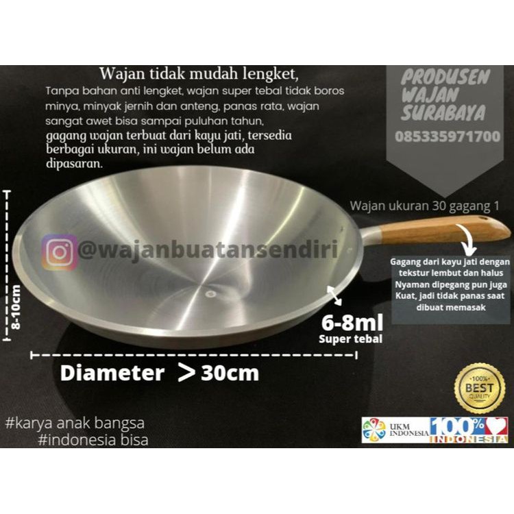 WAJAN / KUALI / PENGGORENGAN SUPER TEBAL HIGH QUALITY ( PREMIUM ) UKURAN 30 GAGANG 1UKURAN 30DIAMETER 30PRODUSEN WAJAN SURABAYA@wajanbuatansendiriWAJAN / KUALI / PENGGORENGAN SUPER TEBAL HIGH QUALITY ( PREMIUM ) UKURAN 30 GAGANG 1kenapa harus beli wajan kami?1.wajan sangat tebal2.awet puluhan tahun3.tidak mudah lengket tanpa bahan anti lengket4.gagang wajan terbuat dari kayu jati5.tidak boros minyak / minyak jernih dan anteng6. warna wajan cerah sehinggah memudahkan kita mengontrol makanan saat kemasukan kotoran diwaktu menggoreng7. super premium sangat tebal8. bagian bawah wajan datar atas wajan cekung sehingga tidak , jadi bisa anteng saat ditaruh9. tidak kalah dengan teknologi teflon10. buatan sendiri / produk dalam negridan belum ada dipasaranWAJAN / KUALI / PENGGORENGAN SUPER TEBAL HIGH QUALITY ( PREMIUM ) UKURAN 30 GAGANG 1TERSEDIA WAJAN BUATAN SENDIRI / PRODUKSI SENDIRI, TIDAK MUDAH LENGKET TANPA BAHAN ANTI LENGKET, SANGAT TEBAL, TIDAK KALAH DENGAN TEKHNOLOGI TEFLON, PEGANGAN WAJAN DARI KAYU JATI, TIDAK BOROS MINYAK DAN TIDAK MUDAH GOSONG.INI WAJAN BELUM ADA DI PASARAN. MADE INDONESIA YUK BERALIH KE WAJAN PRODUKSI DALAM NEGRI TIDAK KALAH BAGUS KUALITASNYA. AWET DAN ISTIMEWAH .TERSEDIA VARIASI PEGANGAN, ADA PEGANGAN MODEL KUPINGAN, ADA PEGANGAN MODEL NASI GORENG. BAWAH WAJAN DATAR, BAHAN DARI ALUMINIUM MURNI YANG BAGUS DAN TEBAL.WAJAN / KUALI / PENGGORENGAN SUPER TEBAL HIGH QUALITY ( PREMIUM ) UKURAN 30 GAGANG 1[ INI WAJAN BELUM ADA DIPASARAN ]#wajan #antilngket #wajanantilengket #frypan #pan #teflonnb ; harap tambahkan / order buble warp untuk packing amannb ; harap tambahkan / order buble warp untuk packing