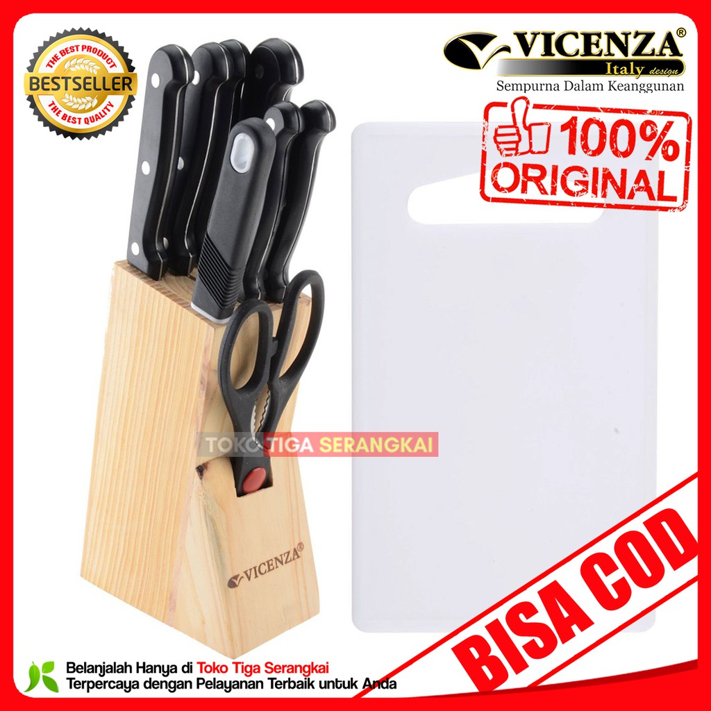 100% ORIGINAL (DIJAMIN)*Stainless Steel*Rak Kayu*Anti Karat & Tahan Lama*Mudah Disimpan*Stok Terbatas * isi Paket 7 buah pisau, 1 buah gunting, 1 buah rak kayu juga 1 buah talenan. Mudahkan saat-saat Anda berada di dapur dengan Vicenza. Kali ini Vicenza mempersembahkan Vicenza Pisau Set 10 Buah. Dilengkapi dengan kotak kayu untuk menyimpan pisau, Anda tidak perlu meletakkan pisau secara acak yang bisa saja hilang. Dilengkapi dengan berbagai warna menarik, Vicenza akan melengkapi peralatan dapur Anda dengan harga terjangkau. Material Stainless SteelVicenza Pisau menggunakan material stainless steel untuk pisaunya. Material ini membuat produk menjadi anti karat sehingga mudah dibersihkan. Anti karat juga membuat produk menjadi tahan lama sehingga Anda tidak perlu membeli barang yang sama dalam waktu dekat.Set PisauProduk ini merupakan set pisau yang terdiri dari 7 buah pisau, 1 buah gunting, 1 buah rak kayu juga 1 buah talenan. Rak kayu yang disediakan akan membantu Anda dalam menyimpan pisau-pisau tersebut, jadi Anda tidak perlu bingung untuk menyimpan pisau-pisau ini. Gunting juga disediakan ketika Anda membutuhkannya untuk membuka berbagai kemasan makan. Sementara talenan juga termasuk di dalamnya sebagai wadah saat Anda memotong atau mengiris.Desain ErgonomisVicenza telah dikenal sebagai salah satu penghasil produk peralatan rumah tangga yang berkualitas. Untuk itu, masalah desain tidak perlu dipertanyakan lagi. Vicenza Pisau Set ini menggunakan pegangan yang terbuat dari plastik dan terasa ergonomis saat Anda menggunakannya sehingga tangan Anda tidak akan terasa pegal saat memo