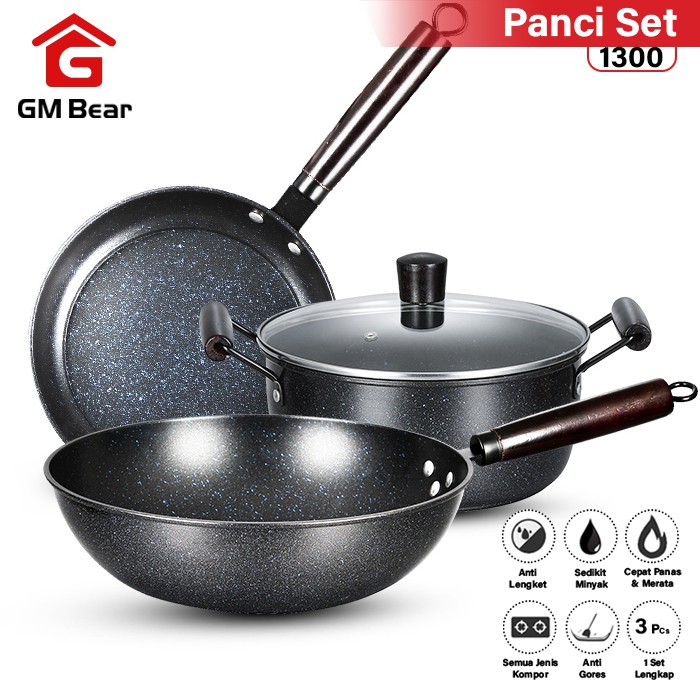 GM Bear Panci Set isi 3 pcs Marble Coating 1300 - Blaze Wajan SetGM Bear Panci Set isi 3 pcs terbuat dari bahan marble coating berkualitas. Sama seperti wajan atau panci yang menggunakan teflon, lapisan marble berguna untuk membuat alat masak tidak mudah lengket serta lebih tahan lama. Keuntungan lain memasak dengan wajan yang dilapisi marble ialah Anda dapat mengurangi pemakaian minyak goreng. Artinya, Anda tidak hanya bisa menghemat dana untuk membeli minyak goreng. Tapi juga dapat mengurangi risiko kolesterol tinggi. Pengaplikasian bahan marble juga menunjang hematnya pemakaian gas karena wajan jadi lebih cepat mendistribusikan panas. Lalu, wajan juga lebih awet karena lapisan marble tidak mudah terkelupas walaupun Anda membersihkan menggunakan spons kasar.GM Bear Panci Set isi 3 pcs menggukan gagang kayu tebal sehingga sangat aman digunakan, dilengkapi juga dengan tutup kaca untuk soup pot.Spesifikasi Produk :Isi : 3pscBahan : Marble Coating PremiumDiameter produk :Soup Pot : 25cm (termasuk tutup kaca)Fry Pan : 25cmFry Wok : 30cmNote: Pesanan diproses pada Hari Senin s.d Sabtu Pengiriman dapat berubah saat Big CampaignHarap pastikan pesanan yang Anda terima sudah sesuai, sebelum menyelesaikan pesanan (retur hanya dapat dilakukan sebelum pesanan diselesai