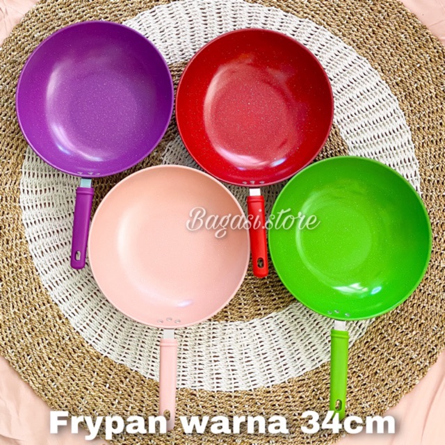WAJAN GAGANG WARNA/ FRYPAN WARNA 34CMMohon cantumkan warna yg di inginkan saat checkout yah kak Bahan Enamelagar lebih aman silahkan order packing tambahan bubble wrap di toko kami kak * Non Stick Coating* For Healthy Cooking* Can be use for electric cooker* Use less oil* Even heating and rustproof* Easy to CleanKelebihan produk :- Lapisan tidak bisa berkarat- Bahan tebal, kuat dan tahan lama.- Handle tidak panas, nyaman ditangan- Mudah dibersihkan. Sesaat setelah kamu memasak semur, sop ataupun gorengan, kamu hanya perlu mengelapnya dengan spon ataupun busa, praktis dan simpel kan!- Anti gores (Jangan Menggunakan bahan Stainless atau pun Besi)- Peralatan berbahan dasar enamel juga bisa dianggap sebagai barang mewah karena presentasinya yang elegan. Selain itu karena tahan lama dan juga terlihat mewah,- Peralatan berbahan dasar enamel juga non toxic alias tidak beracun sama sekali sehingga sangat aman untuk berbagai keperluan didalam rumah.Kelemahan Produk:- Tidak di perbolehkan menggunakan bahan stainless atau pun besi karena bisa merusak lapisan enamel,- Tidak semua produk enamel sempurna karena ada beberapa produk sedikit terkelupas dan harap di maklumi ( NO COMPLAIN).Spesifikasi :Diameter 34cmTinggi -+ 9cmBahan Enamel#wajanenamel #wajanwarna #wajan32 #wajan34 #penggorengan