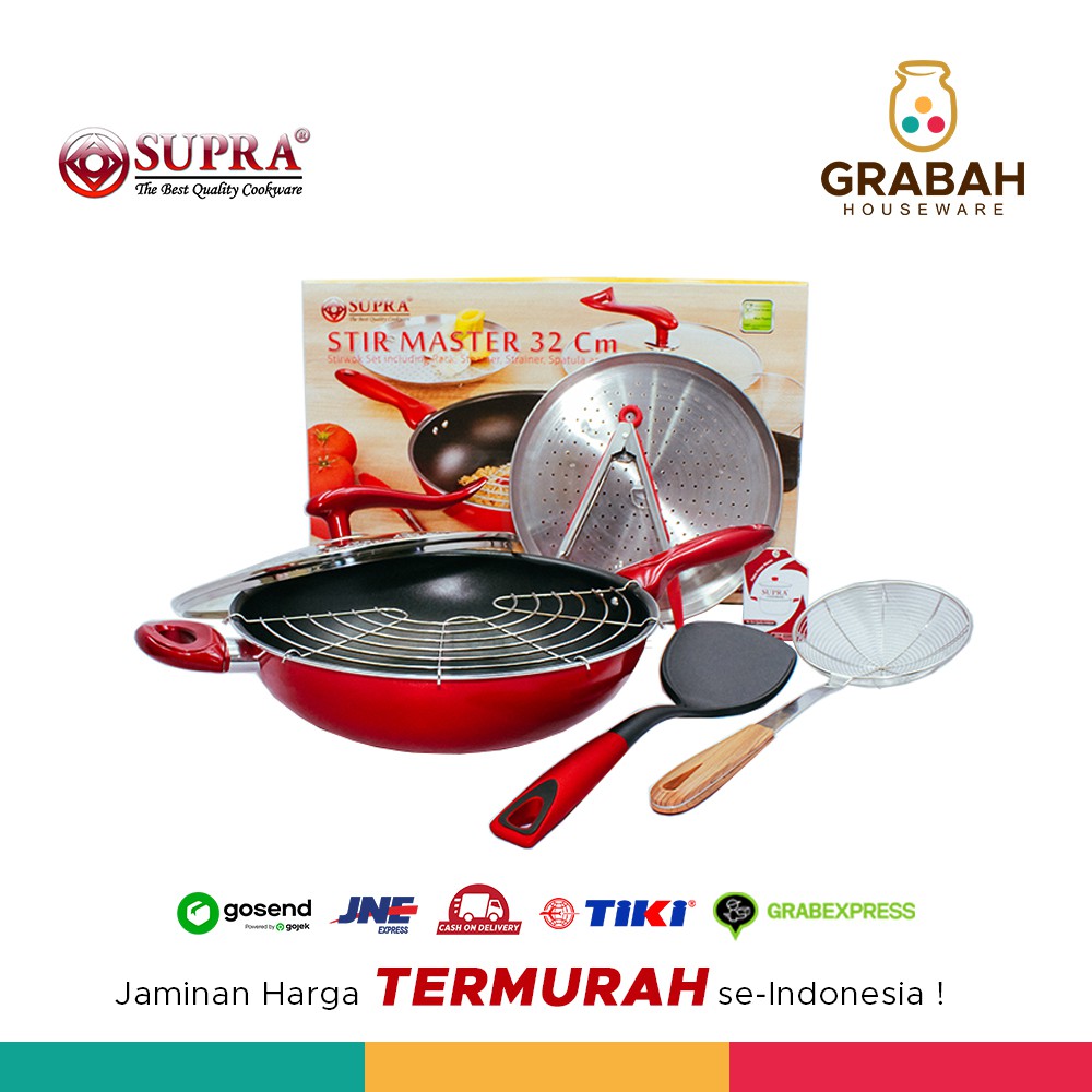 Supra Wajan Set Wok Teflon Wajan Anti Lengket Untuk Memasak Stir Master 32 cmGaransi Harga Termurah Se-IndonesiaOngkir Murah Pilih JNE JTRISI 1 set Stir MasterTerdiri dari :1 pcs Rak Tempura1 pcs Steamer1 pcs Strainer1 pcs Spatula1 pcs Tong1 pcs Stir Wok1 pcs LID FREE PACKING BUBBLE WRAP MOHON DIPERHATIKAN :1. Order barang pecah belah WAJIB DIASURANSIKAN 2. Jika terjadi masalah barang bisa langsung kontak Admin melalui chat3. WAJIB memberi ulasan terbaik (BINTANG LIMA)4. SEMUA PRODUK DI DINI DIJAMIN ORIGINAL BRAND TERSEBUTTerima kasih,SELAMAT BERBE