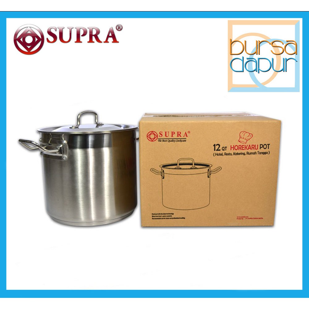 Supra Horekaru 12 Qt / Panci Stainless Double Bottom Impact [12 Qt / 11 Liter] Dimensi Produk : Diameter : 25,5 cm Lebar (pegangan) : 38 cm Tinggi : 23,5 cm Tinggi + Tutup : 29 cm Kapasitas : 11,3 Liter Berat : 2365 gram/ 2,3 kg * Ukuran Dus : 31 x 32,5 x 26 cm* Cocok dipakai pada kompor Induksi/Electric/Listrik ( dasar panci tebal, stainless 1 cm / Double Bottom impact )Supra Horekaru 12 Qt / Panci Stainless Double Bottom Impact [12 Qt / 11 Liter] Merupakan salah satu produk supra yang di fungsikan sebagai panci untuk memasak dengan dua lapisan stainless di bagian dasar/bawah panci (double bottom stainless) sehingga mempercepat proses pemanasan secara merata. Panci Horekaru ini banyak digunakan untuk keperluan hotel, restorant, catering dan juga cocok untuk keperluan rumah tangga.Produk Stainless Steel terbaik untuk semua kebutuhan memasak anda. Menggunakan stainless steel berkualitas tinggi dan tebal, dan finishing mengkilap dengan ketahanan penggunaan terus menerus bertahun-t