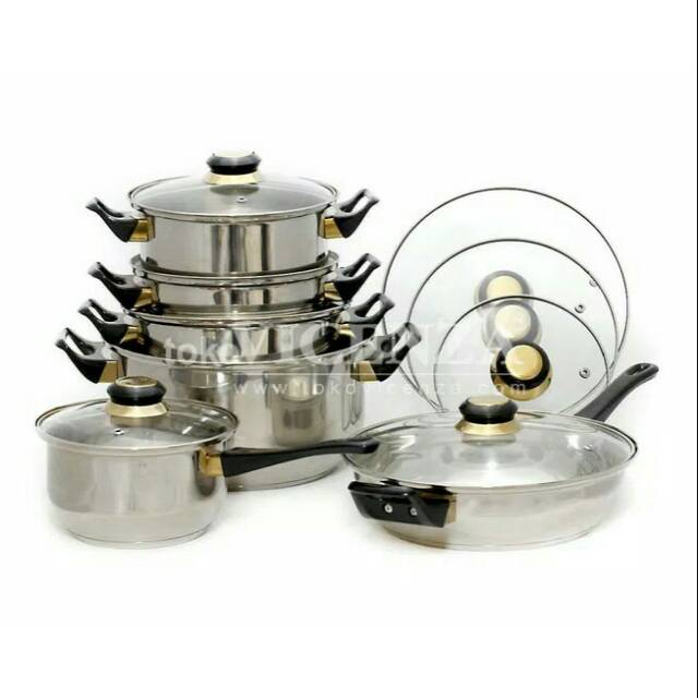 Satu set alat memasak yang terbuat dari stainless steel yang dilengkapi dengan gagang anti panas yang terbuat dari PVC. Satu set alat masak ini akan sangat membantu anda dalam mengolah bahan makanan untuk disajikan bagi keluarga. Sangat cocok digunakan untuk di rumah ataupun di restoran.Terdiri dari :2 Buah Panci Kecil 16 cm + Tutup1 Buah Panci Sedang 18 cm + Tutup1 Buah Panci Sedang 20 cm + Tutup1 Buah Penggorengan Besar 24 cm + Tutup1 Buah Panci Besar 24 cm + T