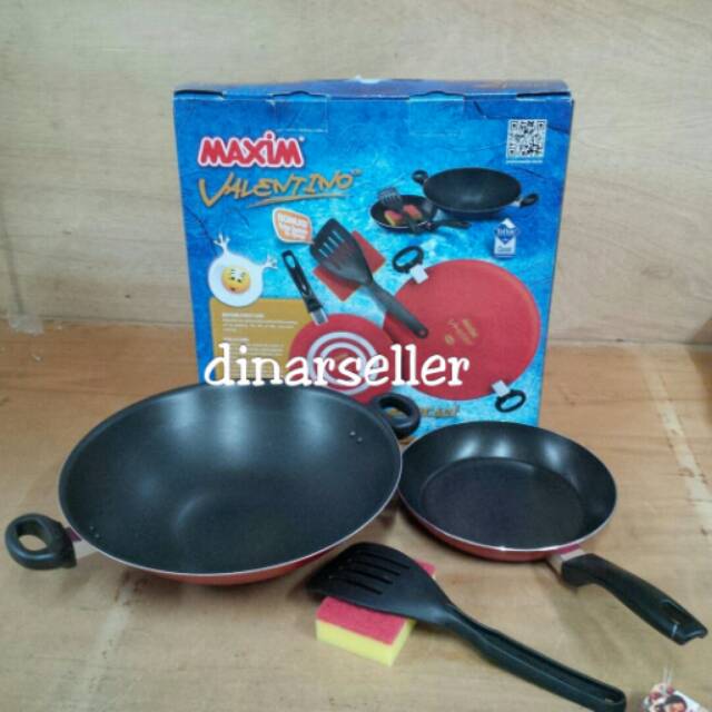 Teflon Berkualitas Anti Gores Anti Lengket Distribusi Panas Merata Mudah DibersihkanApa yang ada di dalam kotak?1 x Wajan 30 cm1 x Penggorengan 22 cm1 x Spatula1 x SponsFitur:Brand: MaximWarna :MerahMaterial Utama :AluminiumUkuran (L x W x H cm) :38 x 11 x 38.5 cmSatu set alat masak yang terdiri dari 1 buah wajan dan 1 buah penggorengan yang terbuat dari teflon berkualitas sehingga membuatnya mampu mendistribusikan panas dengan baik dan merata. Anda dapat memasak hanya dengan minyak secukupnya atau bahkan tidak menggunakan minyak sama sekali sehingga dapat membuat masakan anda lebih rendah lemak. Interiornya terbuat dari lapisan teflon anti lengket sehingga lebih tahan lama dan mudah dibersihkan. Dapatkan juga gratis satu buah spatula dan spons.#TEFLON #PANCI #WAJAN #ALATMASAK #KADO #MAXIM #VALENTINO