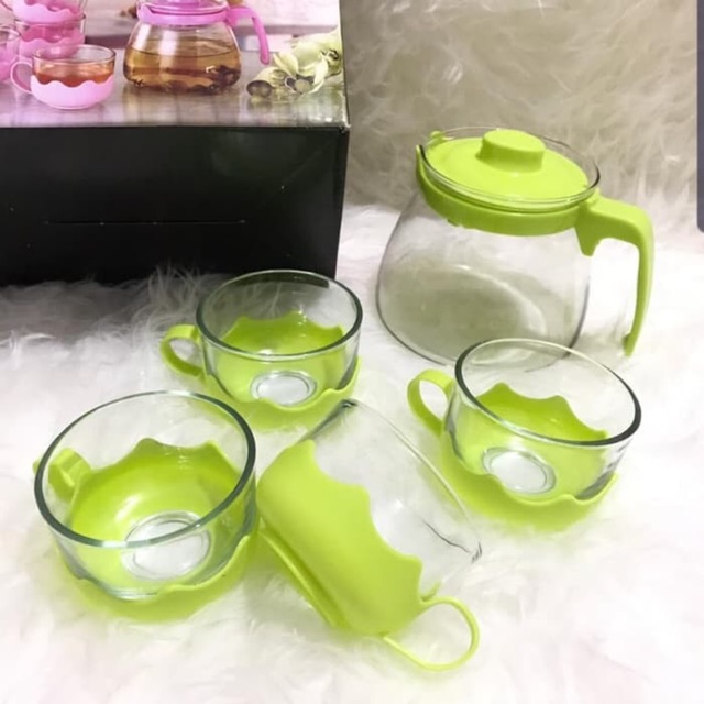 TEA TEH SET 5 IN 1 TEKO + GELAS KACA ANTI SELIP GROSIR TER